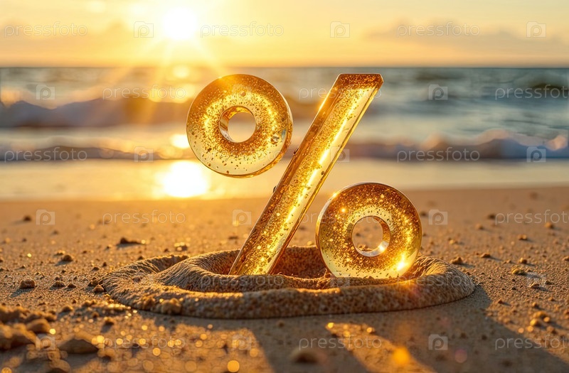 Светящийся золотой процентный знак на берегу моря На песке при закате солнца, туристический морской фон. Горячая летняя распродажа и скидки, горящий тур-баннер, флаер. ИИ генерируется