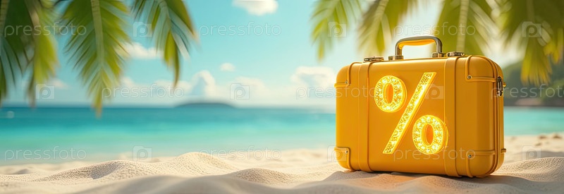 Золотой светящийся знак процент И желтый чемодан на берегу моря с тропическими пальмами под ярким солнцем, океанический закат в фоне. Горячие летние распродажи и скидки, горячий туристический баннер, листовка. AI генерируется