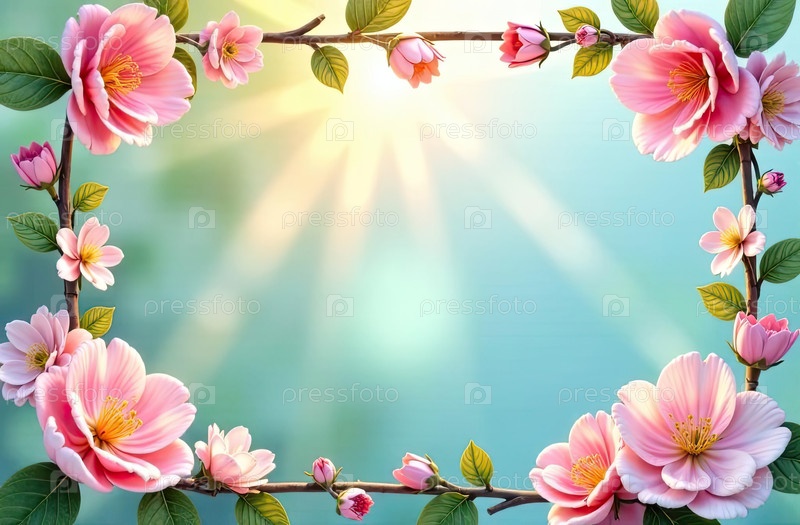 Весенняя тематическая декоративная рама с текстом внутри в солнечных лучах, украшена весенними пастельными цветами на весенне-синем фоне