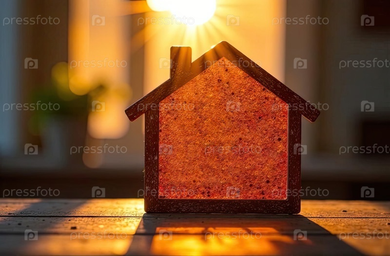 Деревянная рама в форме дома с пространством для текста внутри помещений со солнечным светом. недвижимость, риэлтор, ипотека, страхование, бронирование. ИИ генерируется