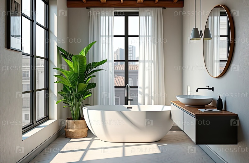 Ванная комната в стиле лофт с окном, большие горшечные растения, круглое зеркало. дизайн интерьера. современный ИИ генерируется