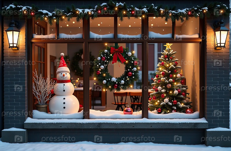 Наружное уютное окно с рождественским декором и теплым светом внутри - вид снаружи дома. отпразднуйте Рождество и Новый год, елку, боке, снег. созданный ИИ