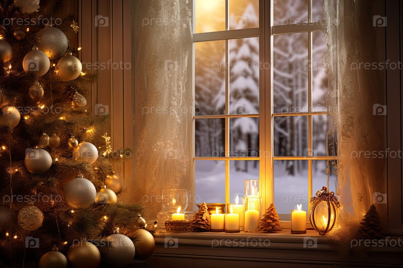 Внутреннее уютное окно с рождественским декором и теплым светом - вид изнутри зимой и снегом. отпразднуйте Рождество и Новый год, елку, боке, снег. ИИ генерируется