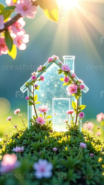 Крошечный экологический дом теплица в солнечных лучах, с весенними пастельными цветами на весеннем пастельно-синем фоне. недвижимость, риэлтор, ипотека, страхование, бронирование, строительство, изоляция. ИИ генерируется