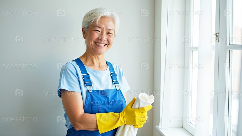 Портрет взрослой азиатской женщины в синем фартуке и желтых резиновых перчатках с тряпкой в руке у окна против белой стены, служба очистки окон, уборка дома