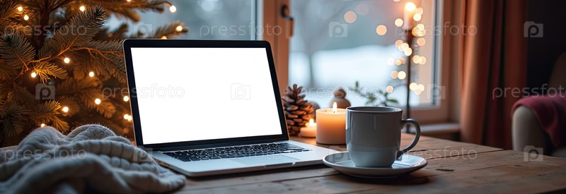 Ноутбук с белым экраном макет на столе в уютном домашнем офисе рождественского декора в стиле лофт