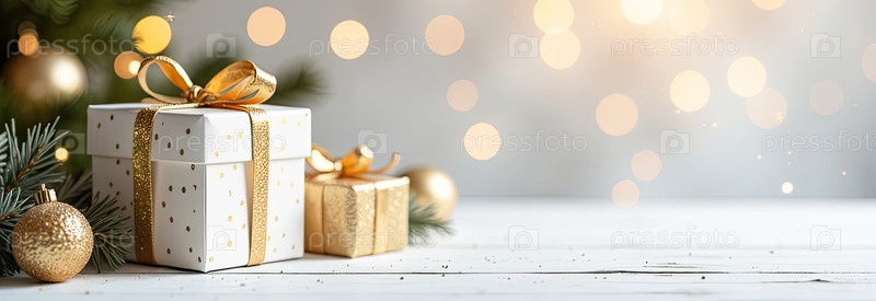 Рождественский фон с белыми коробками для подарков со золотыми лучами, светящимся боке и блеском. Праздничное настроение Карта на Рождество и Новый год с копировальным пространством. ИИ генерируется