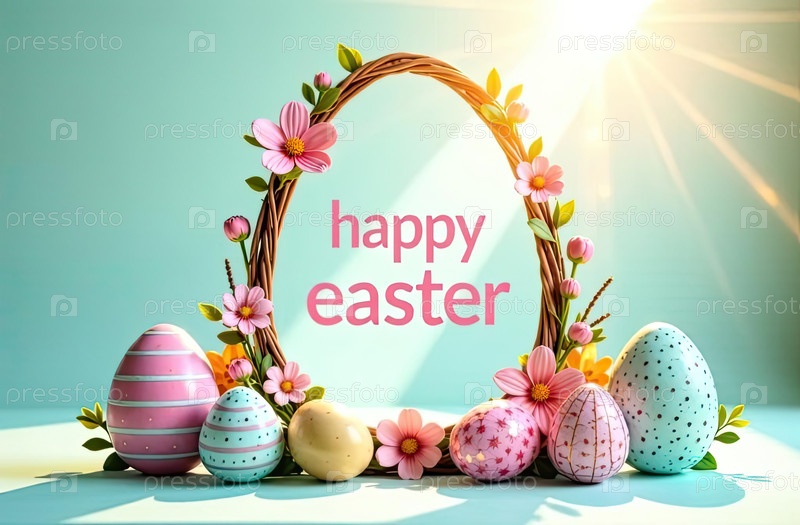 Декоративная рама на тему пасхального яйца с текстом Счастливая Пасха внутри в солнечных лучах, украшена весенними пастельными цветами и пасхальные яйца украшены узорами, полосами, волнами, точками