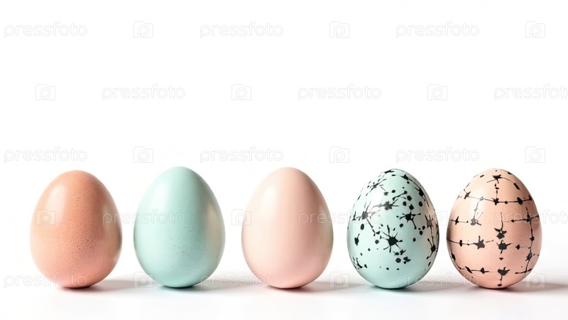 Внизу изображения пять яиц со свободным пространством сверху для текста, творческий цветочный черный рисунок на цветах-яйцах, белый фон. Пасхальный баннер с пробелом для текста. ИИ генерируется