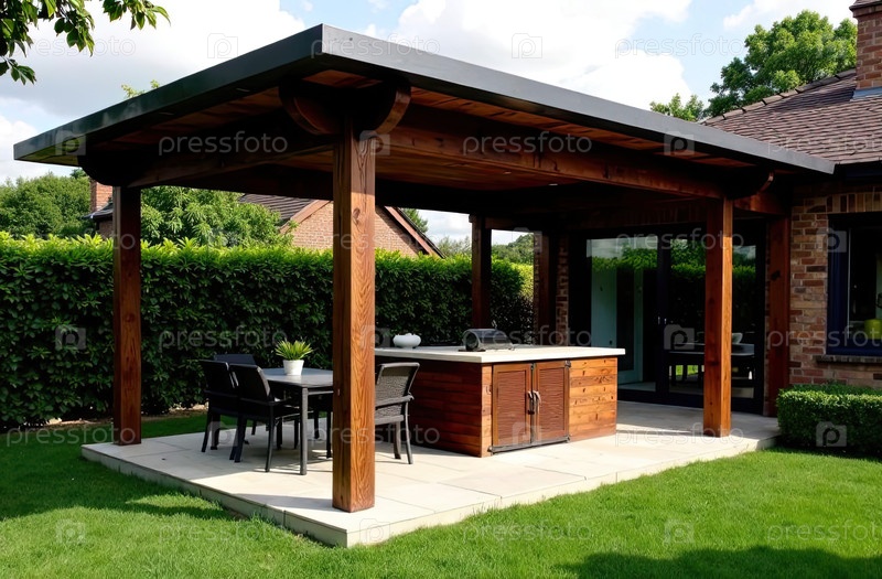 Газебо с зоной для барбекю во дворе дома с барбекью, плитой, столом, крышей