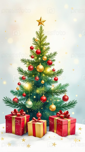 Акварельная зеленая рождественская елка и коробки для подарков на сияющем фоне.Поздравление к Рождеству и Новому году.Искусственный интеллект создан