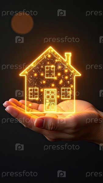 Золото светящийся символ уютного дома В ладонях рук с золотым блеском. Недвижимость, риэлтор, ипотека, страхование, бронирование, изоляция, мечта о собственном доме. ИИ генерируется