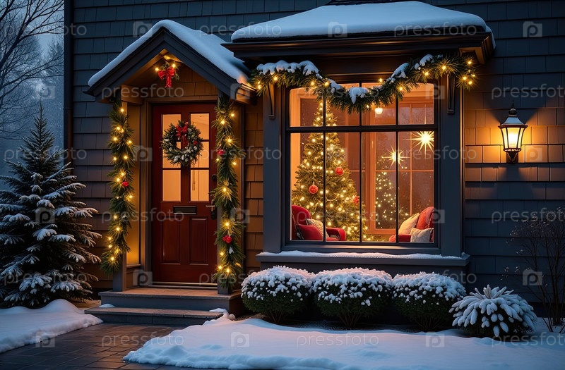 Наружное уютное окно с рождественским декором и теплым светом внутри - вид снаружи дома. отпразднуйте Рождество и Новый год, елку, боке, снег. созданный ИИ