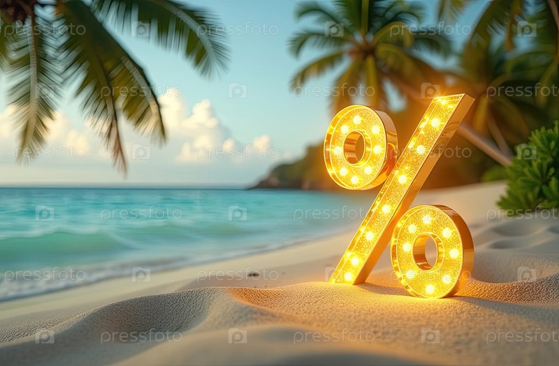 Яркий золотой процентный знак на берегу моря с тропическими пальмами в свете солнца, туристический морской фон. жаркая летняя распродажа и скидки, горящий тур-баннер, флаер. ИИ генерируется