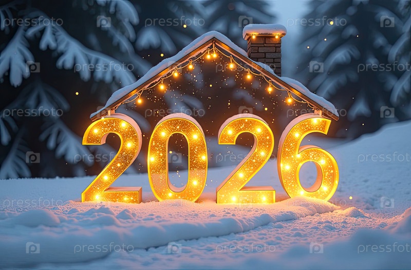 Прозрачное золото светящиеся числа 2026 под крышей дома на снежном фоне Нового года с золотым блеском