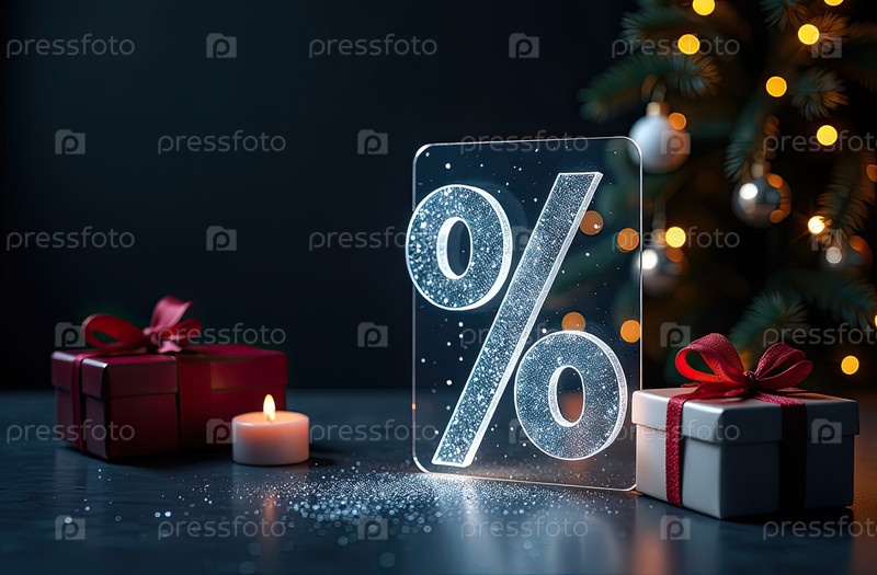 Неон светящийся синий процентный знак на рождественском фоне с елкой, блесками и коробками для подарков. Черная пятница, Новый год, Рождественская распродажа, скидки. баннер, флаер с копировальным пространством. ИИ генерируется