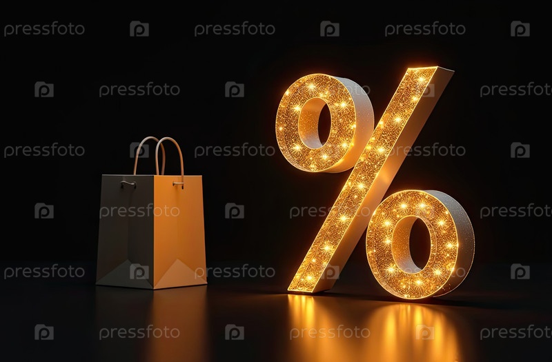 Неон светящийся золотой процентный знак на черном фоне. витрина магазина для Черной пятницы, распродажи, скидки, сумки для покупок. баннер, флаер. AI generated