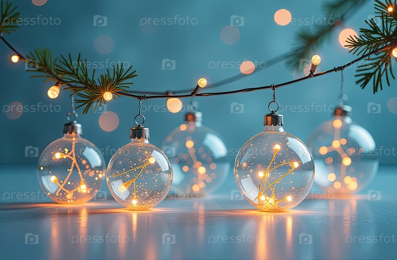 Гирлянда светящихся прозрачных шаров с золотыми огнями на синем фоне с блеском и боке. поздравительная карточка на Рождество и Новый год. ИИ генерируется