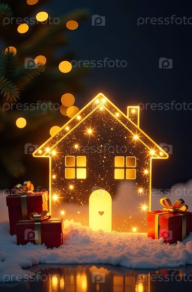 Прозрачное золото светящийся символ дома и коробка для подарков под елкой на рождественском фоне с золотым блеском