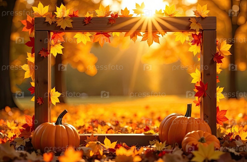 Рама украшена желтыми кленовыми листьями на осеннем фоне с тыквой в лучах солнца. баннер урожая и Хэллоуин, флаер с копировальным пространством. ИИ генерируется