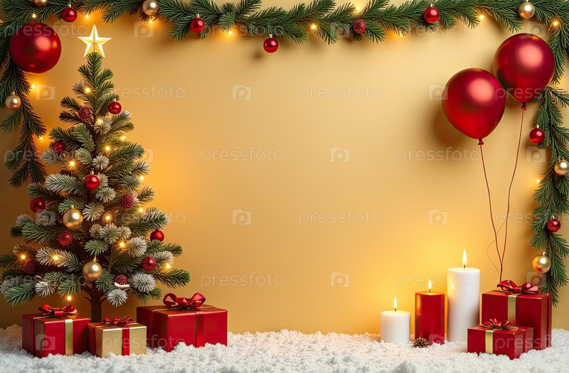 Рождественские поздравительные открытки приглашение с пространством для текста в раме на золотом фоне со светящейся рождественской елкой и гирляндой, шарами, подарочными коробками