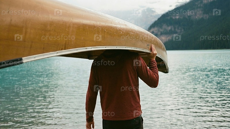Человек, несущий каноэ на плечах возле озера с горами при восходе солнца, приключенческий образ жизни, сольное исследование, путешествия на открытом воздухе, дух природы