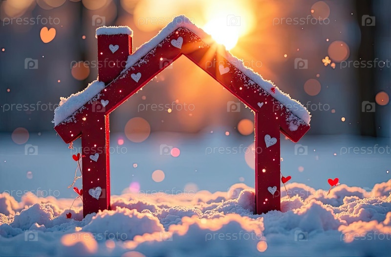 Уютный красный крошечный дом на снегу в солнечных лучах, украшенный красным сердцем и декором Валентина