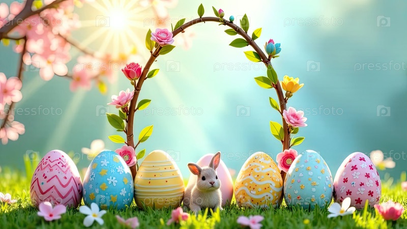 Декоративная рама на тему пасхальных яиц с текстом внутри в солнечных лучах, украшена весенними пастельными цветами и пятью большими пасхальными яйцами, украшенными узорами, полосами, волнами, точками