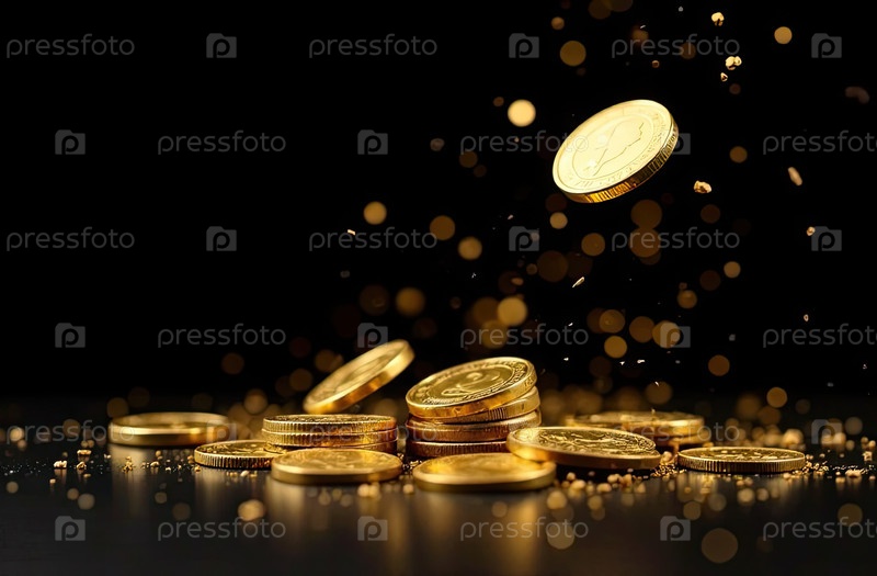 Стол золотых монет на черном фоне с блеском.Сбережения, инвестиции, капитал, бизнес.Искусственный интеллект генерирует