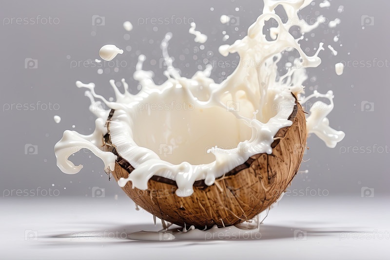 Плески кокосового молока, выплескавшиеся из кокоса в ближайшем кадре на сером фоне