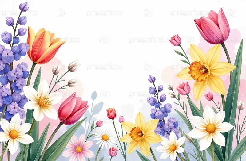 Рамка акварели с весенними цветами тюльпаны, нарциссы-Весенняя открытка со свободным местом для текста на 8 марта, женский день, Пасху