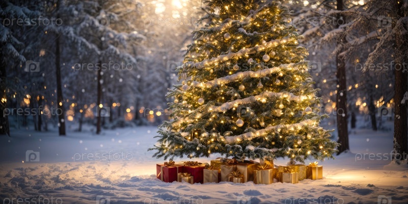 Фея Рождественская елка светит теплыми фейриными огнями с золотым декором в лесу зимой со снегом, коробки с подарками лежат под елой.Рождество и Новый год, праздничное настроение, поздравительная открытка