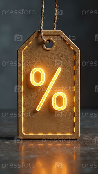 Неон светящийся золотой процентный знак на ценнике на сером бетонном фоне.Флаер для Черной пятницы, распродажа, скидки.Искусственный интеллект создан