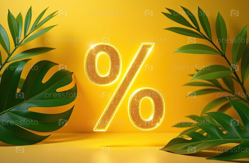 Яркий золотой процентный знак на желтом фоне с пальмами и тропическими растениями. жаркая летняя распродажа и скидки, горящий туристический баннер, флаер. ИИ генерируется