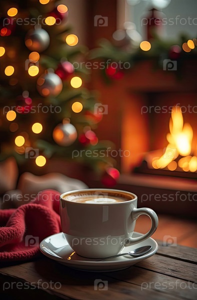 Теплая чашка кофе возле камина в уютном теплом трикотажном платье и рождественский декор.Уютная зима, Рождество, Новый год. ИИ генерируется