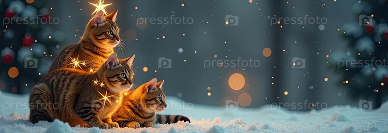 Рождественская елка из кошек, сделанная на праздничном снежном фоне с блеском, многоцветные сотни кошек складываются в форме высокой рождественской елки с золотыми светящимися гирляндными огнями