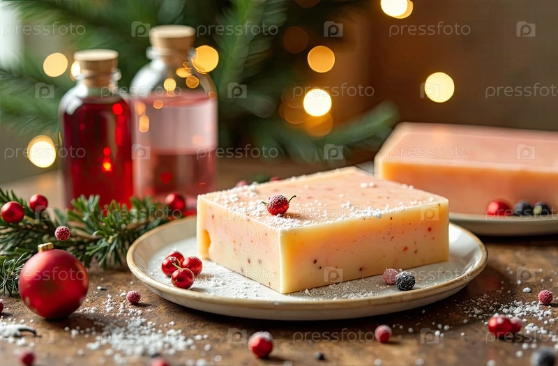 Ручно сделанное натуральное эко мыло на столе с бутылками с ароматизатором, красителем и основой для мыла на рождественском фоне. Подарок, подарок, ремесло на Новый год и Рождество. Производство любительского мыла, домашнее изготовление. ИИ генерируется;