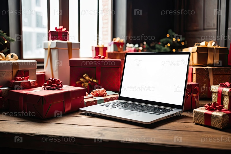 Ноутбук с белым экраном макет на столе в офисе рождественского декора с подарочными коробками для сотрудников, магазины, корпоративные подарки, Черная пятница,