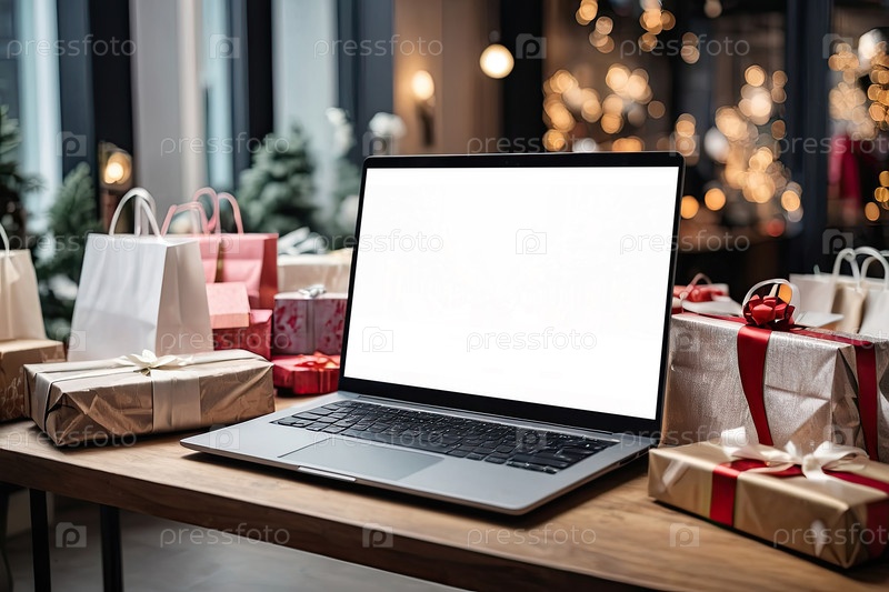 Ноутбук с белым экраном макет на столе в офисе рождественского декора с подарочными коробками для сотрудников, магазины, корпоративные подарки, Черная пятница,