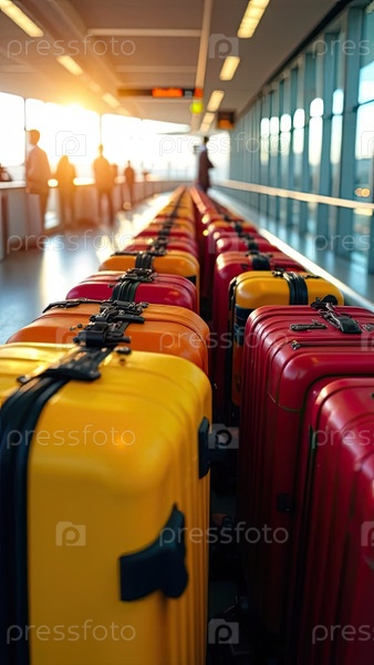 Куча желтых и красных чемоданов в аэропорту - контроль грузов, допускаемый багаж и параметры ручной клади на самолете, охрана, регистрация и доставка личных вещей