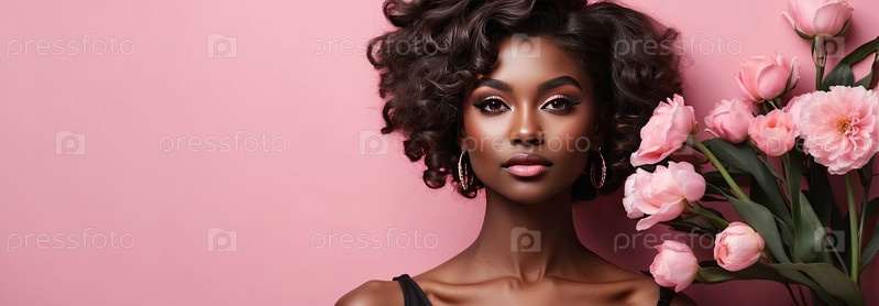 Черная женщина с темно-волокнистыми волосами и розовым букетом цветов, весенний цветочный портрет, женственность, элегантность, расширение прав и возможностей, 8 марта, день женщин