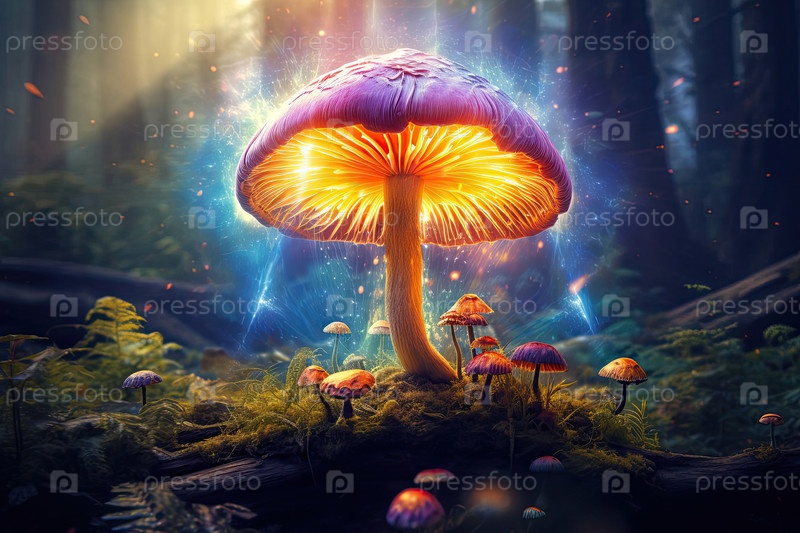 Высокий золотистый псилоцибиновый гриб, светящийся в зачарованной ночи, галлюцинационные споры, наркотическая поездка, мир фантазии и психоделической зависимости