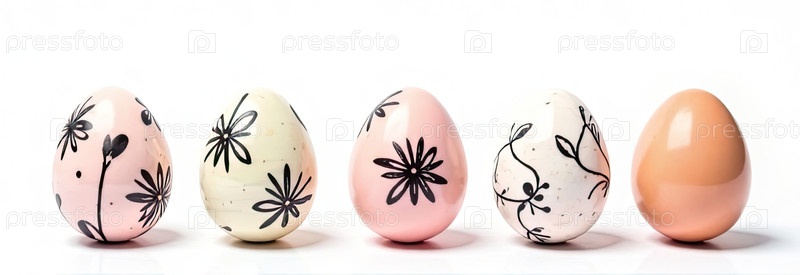 Внизу изображения пять яиц со свободным пространством сверху для текста, творческий цветочный черный рисунок на цветах-яйцах, белый фон. Пасхальный баннер с пробелом для текста. ИИ генерируется