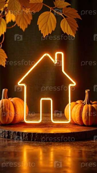 Золотой неон светящийся логотип Крошечный дом с тыквами и желтыми кленовыми листьями на осеннем фоне. Недвижимость, дача, летний домик, ипотека, страхование, бронирование, строительство, изоляция. ИИ генерируется