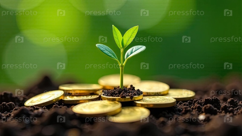Молодой зеленый побег растет из земли и золотые монеты вблизи на зеленом фоне. Экономика, финансы, экология, стартап. ИИ генерируется