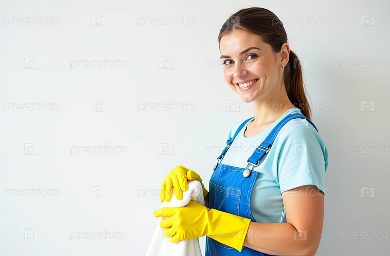 Портрет молодой женщины в синем фартуке и желтых резиновых перчатках с тряпкой в руке у окна против белой стены, служба очистки окон, уборка дома