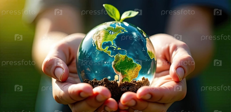 Светящаяся стеклянная сфера планеты Земля с зелеными растениями, растущими в руках детей, забота о планете, чистая окружающая среда, защита экологии, зеленая планета