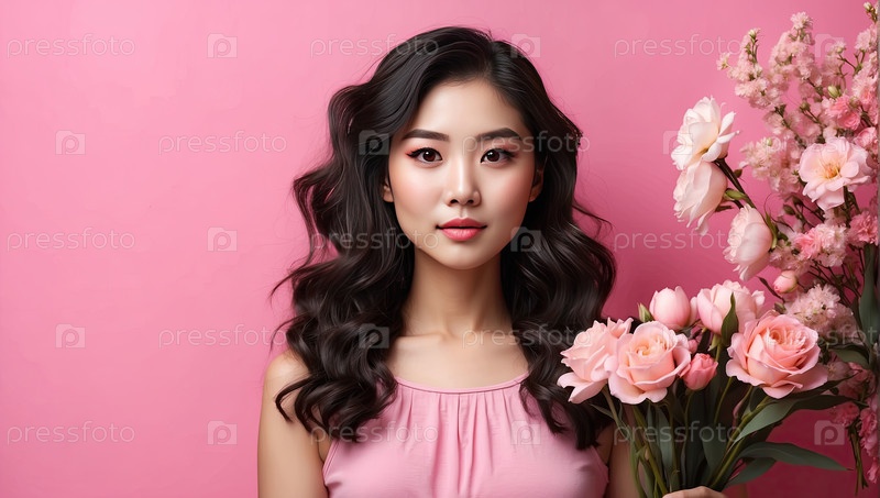 Азиатская женщина с распущенными волнистыми волосами и розовыми пионками, портрет красоты в весенней цветочной тематике, женственность, радостное вдохновение, женский день 8 марта