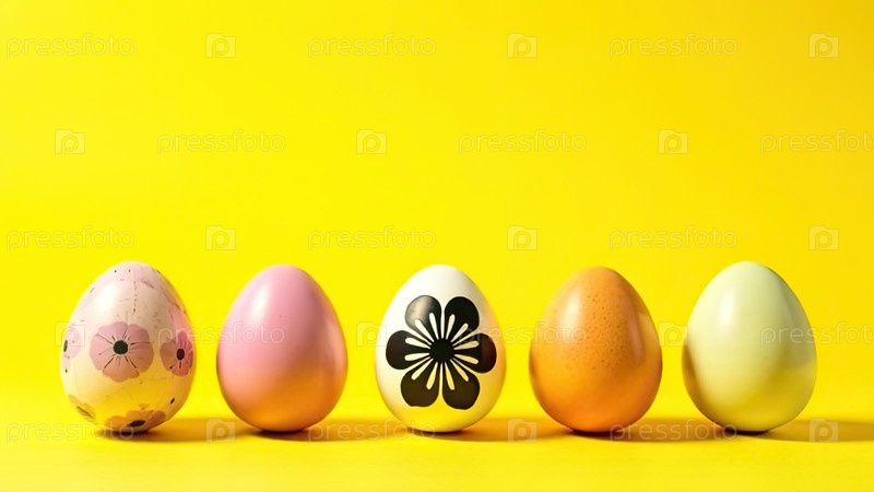 В нижней части изображения пять яиц со свободным пространством сверху для текста, творческий цветочный черный рисунок на цветах яйца, желтый фон. Пасхальный баннер с пробелом для текста. ИИ генерируется