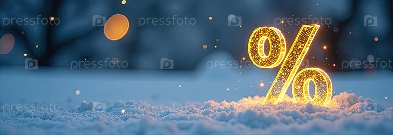 Неон светящийся золотой процентный знак на снежном фоне снаружи, блеск и снежинки. Зимняя распродажа и скидки, Черная пятница, Новый год, Рождество. баннер, флаер с копировальным пространством. ИИ генерируется